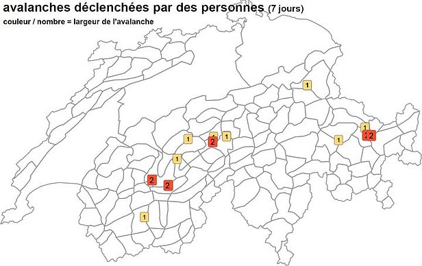 - Localement, des personnes pouvaient déclencher des avalanches. Celles-ci étaient généralement petites (taille 1), mais parfois aussi moyennes (taille 2) (cf. figure 1). Ces endroits dangereux étaient rares et se situaient surtout là où des accumulations de neige soufflée de la semaine écoulée recouvraient une couche de neige ayant subi une forte métamorphose constructive. C'était surtout le cas sur les pentes à l'ombre, très raides et abritées du vent. En l'absence de cette combinaison de couches, le manteau neigeux était généralement stable.