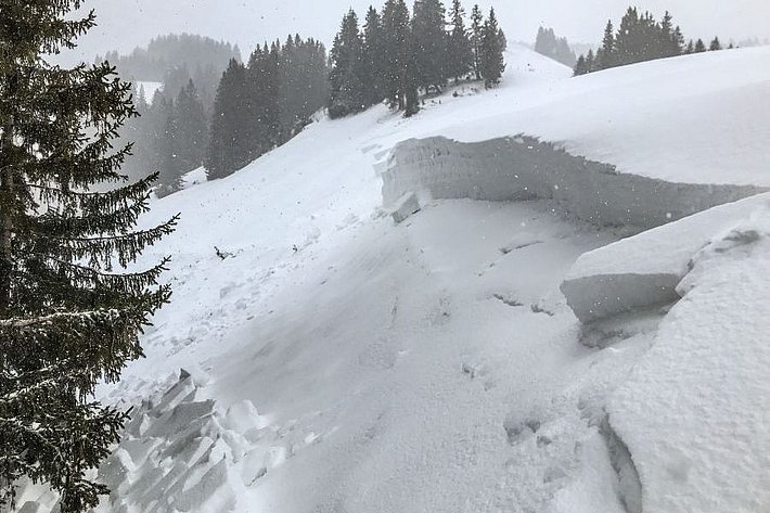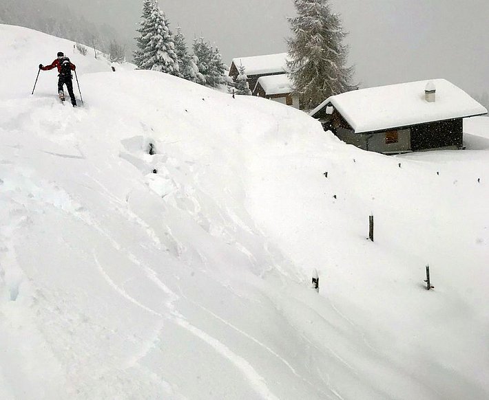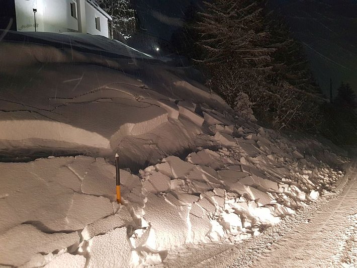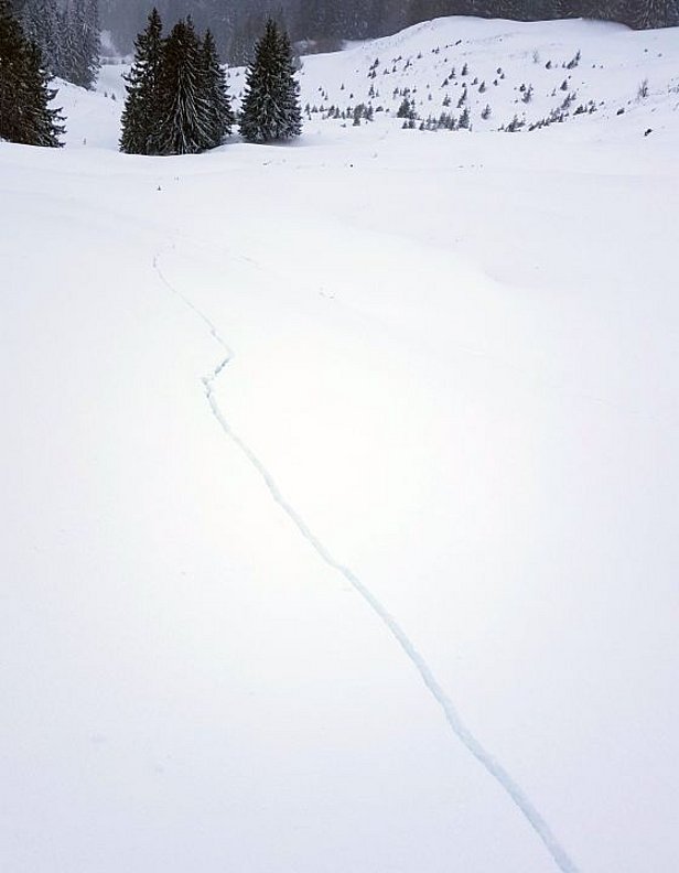 Le vent fort à tempétueux de secteur ouest a donné lieu à la formation d'importantes couches de neige fraîche et de neige soufflée très instables. Jusqu'au mercredi, le danger d'avalanche a augmenté jusqu'au degré 4 (fort) dans certaines parties de l'ouest du versant nord des Alpes et en Valais. De nombreuses avalanches spontanées ont été signalées. Elles descendaient localement jusque dans les vallées (cf. photo 6). Même à moyenne altitude (entre 1000 et 2000 m), le manteau neigeux était très fragile: De longues fissures, des bruits sourds, des déclenchements à distance et des départs spontanés d'avalanches ont été signalés par des randonneurs, des observateurs du SLF et des responsables de la sécurité (cf. photos 7 à 10).