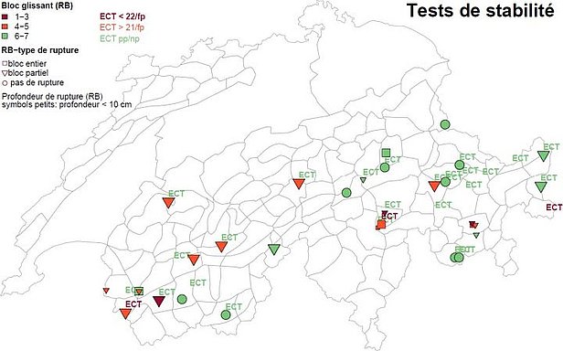 Les tests de stabilité du manteau neigeux donnaient également une image positive comparable: Même une surcharge importante ne permettait souvent pas de provoquer une rupture. Et lorsque des ruptures pouvaient être provoquées dans le manteau neigeux, cela concernait le plus souvent des couches proches de la surface avec des niveaux de charge moyens et une rupture partielle (cf. figure 2).