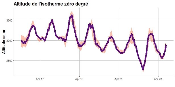 Le temps était également doux pendant cette période couverte par le rapport hebdomadaire. Jusqu’au dimanche 19 avril, l’isotherme zéro degré était située entre 3000 et 3500 m avant de descendre un peu ensuite. Plus particulièrement les nuits du mardi au mercredi 22 avril et du mercredi au jeudi 23 avril étaient nettement plus froides (cf. figure 1).
