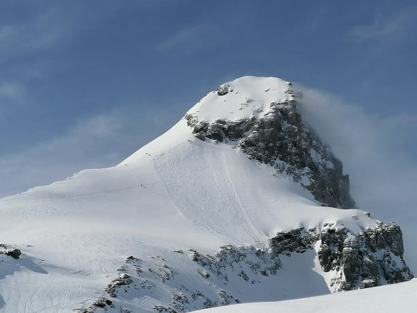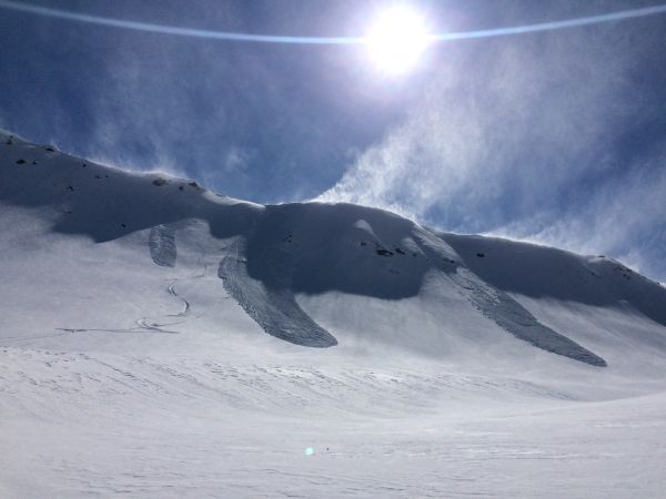 Même s’il n’y avait pratiquement plus de neige pouvant être transportée, le vent fort a donné lieu à la formation de nouvelles accumulations de neige soufflée. A cet égard, on a eu la confirmation que la neige soufflée pouvait se décrocher tout particulièrement en altitude: Dans la plupart des cas, les dépôts de neige étaient certes seulement minces, mais des avalanches de plaque de neige parfois de grande superficie pouvaient néanmoins être déclenchées (cf. photo 2).