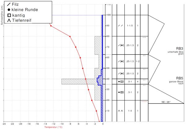 - La première avalanche de plaque de neige s’était vraisemblablement décrochée spontanément. Même s’il n’y a pas de grains anguleux dans le profil, les couches fragiles dans la neige fraîche peuvent néanmoins se décrocher très facilement en peu de temps.