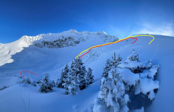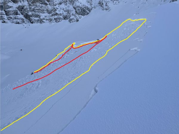 "A notre arrivée, la plaque légèrement enneigée de la dernière période de chutes de neige de la veille (ligne jaune = début de rupture de l’ancienne plaque de neige) était bien visible. Elle s’était décrochée dans une couche à environ 40 cm en dessous de la surface neigeuse. En cherchant un endroit approprié pour relever un profil de neige, en terrain plat 50 m au-dessus de la rupture, un bruit sourd était clairement perceptible. Ce n’est que lorsque j’ai vu le nuage de poudreuse dans le Glögglital que je me suis rendu compte qu’à l’intérieur de la zone de rupture de la première plaque (jaune) une deuxième plaque s’était décrochée (ligne rouge = début de rupture de la seconde plaque de neige). Celle-ci s’était décrochée dans les couches inférieures à proximité du sol et avait un volume nettement plus grand que la première plaque."