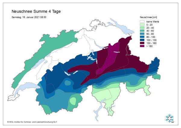 Du mardi 12 au vendredi 15 janvier, les cumuls de neige fraîche atteignaient les valeurs suivantes (cf. figure 1 et photo 2):