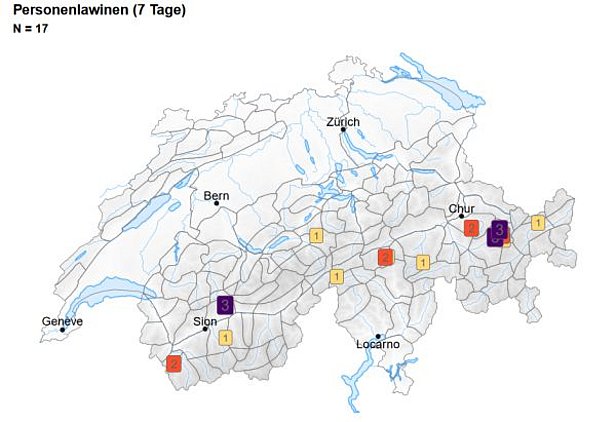 En comparaison avec la dernière période couverte par le rapport, nettement moins d’avalanches impliquant des personnes ont été signalées (17 contre 60 avalanches) (cf. figure 8). Outre quelques petites avalanches dans la neige soufflée, on a aussi signalé des avalanches moyennes et trois grandes avalanches. Ces trois dernières étaient des avalanches de neige mouillée qui se sont décrochées après la mi-journée. Pour limiter les risques liés aux avalanches, il convient de terminer les randonnées à temps !