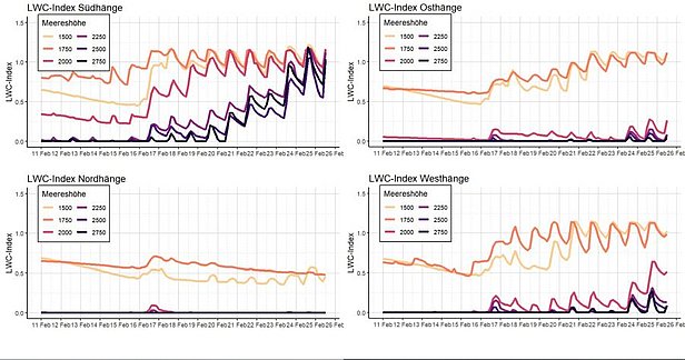 Ces avalanches de plaque de neige annonçaient une nouvelle activité avalancheuse. Avec la persistance d’un temps chaud et un ensoleillement généreux, l’humidification du manteau neigeux a sans cesse gagné en altitude. C’est ainsi qu‘au-dessus de 2000 m environ, le manteau neigeux est devenu pour la première fois isotherme 0°C et humidifié. Cela concernait d’abord uniquement les pentes exposées au sud, car aux autres expositions l’apport d’énergie dû à l’ensoleillement en cette période de l’année et à cause du ciel clair était encore insuffisant pour donner lieu à une humidification. Pour l’évaluation de l’humidification du manteau neigeux, le Service des avalanches du SLF se fonde, d’une part, sur des profils de neige et, d’autre part, sur le logiciel Snowpack de modélisation du manteau neigeux. Ce logiciel calcule, pour chaque station de mesure automatique du SLF, l’indice LWC (Liquid Water Content ou indice de teneur en eau liquide) aux différentes expositions. Lorsque cet indice atteint la valeur 1, le manteau neigeux peut être considéré comme humidifié (cf. figure 5).