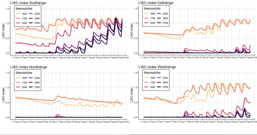 Ces avalanches de plaque de neige annonçaient une nouvelle activité avalancheuse. Avec la persistance d’un temps chaud et un ensoleillement généreux, l’humidification du manteau neigeux a sans cesse gagné en altitude. C’est ainsi qu‘au-dessus de 2000 m environ, le manteau neigeux est devenu pour la première fois isotherme 0°C et humidifié. Cela concernait d’abord uniquement les pentes exposées au sud, car aux autres expositions l’apport d’énergie dû à l’ensoleillement en cette période de l’année et à cause du ciel clair était encore insuffisant pour donner lieu à une humidification. Pour l’évaluation de l’humidification du manteau neigeux, le Service des avalanches du SLF se fonde, d’une part, sur des profils de neige et, d’autre part, sur le logiciel Snowpack de modélisation du manteau neigeux. Ce logiciel calcule, pour chaque station de mesure automatique du SLF, l’indice LWC (Liquid Water Content ou indice de teneur en eau liquide) aux différentes expositions. Lorsque cet indice atteint la valeur 1, le manteau neigeux peut être considéré comme humidifié (cf. figure 5).