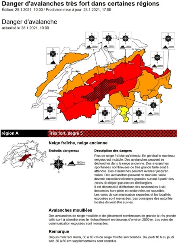 Pendant la nuit du mercredi au jeudi, les précipitations étaient plus abondantes que prévu dans certaines régions. Dans l’est des Alpes bernoises et dans le nord du Valais, déjà de très grandes avalanches et localement aussi des avalanches d’ampleur extrême ont été observées ou enregistrées par les systèmes de détection automatique jusqu’au jeudi matin. Avec les précipitations parfois encore très intenses attendues le jeudi et l’arrivée d’un vent tempétueux en altitude, le danger d’avalanche a encore augmenté le jeudi. Le jeudi matin 28 janvier, un nouveau bulletin d’avalanches (non annoncé) a été diffusé. Dans ce bulletin d’avalanches, le danger d’avalanche a été accru du degré 4 (fort) au degré 5 (très fort) dans les régions allant du Lötschental jusque dans les Alpes uranaises en passant par la vallée de Conches ainsi que du degré 3 (marqué) au degré 4 (fort) dans certaines régions du nord du Tessin (cf. figure 10).