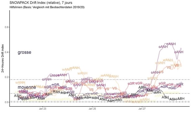 Avec le début de la troisième période de précipitations de cette semaine (cf. figure 5), le danger d’avalanche a augmenté sensiblement sur une grande partie du territoire. Dans le courant de la journée du mercredi 27 janvier, le degré 4 (fort) a été atteint sur la crête nord des Alpes ainsi que dans le sud du Valais. Pour le jeudi 28 janvier, le degré 4 (fort) de danger d’avalanche était annoncé dans une grande partie de l’ouest et du nord. D’importantes accumulations de neige soufflée se sont formées en altitude. Sous le poids de la grande surcharge due à la neige fraîche et à la neige soufflée, davantage d’avalanches se sont décrochées dans la neige ancienne et ont atteint une grande ampleur. De plus, la pluie a fragilisé le manteau neigeux à basse et moyenne altitude donnant lieu à plus d’avalanches de neige mouillée et de glissement.