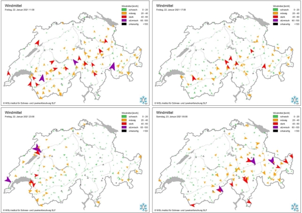 Le samedi était partiellement ensoleillé dans l’ouest et généralement nuageux ailleurs. Au cours de l‘après-midi, de nouvelles chutes de neige sont arrivées par l’ouest. Au début, le vent de secteur sud était encore modéré à fort dans le nord, puis pendant la nuit du vendredi au samedi, il s’est orienté au nord-ouest et les précipitations ont cessé dans le sud. Le vent du nord-ouest s’est ensuite intensifié devenant modéré à fort en altitude, tandis que dans le nord, le vent soufflait du secteur ouest (cf. figure 3).