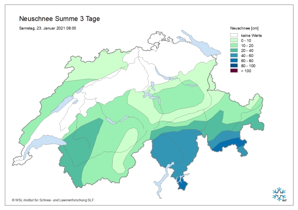 Pendant la nuit du jeudi au vendredi, il a neigé dans l’ouest et le sud. En cours de journée, il y a eu des éclaircies temporaires, mais dès l’après-midi, il a à nouveau neigé sur le versant sud des Alpes et dans le Jura, et ces chutes de neige se sont intensifiées dans la nuit du vendredi au samedi. La limite des chutes de neige se situait d’abord entre 1000 et 1500 m et elle est descendue jusqu’à basse altitude pendant la nuit du vendredi au samedi. Globalement, de 40 à 70 cm et localement jusqu’à 90 cm de neige sont tombés depuis le mercredi après-midi 20 janvier jusqu’au samedi matin 23 janvier à haute altitude sur une grande partie du versant sud des Alpes ainsi que de la crête principale des Alpes depuis le San Bernardino jusqu’au col de la Bernina. Dans les Alpes fribourgeoises et vaudoises ainsi que dans le nord et la partie la plus occidentale du Bas-Valais, l’apport de neige était de 20 à 40 cm; ailleurs, il était plus faible (cf. figure 2).