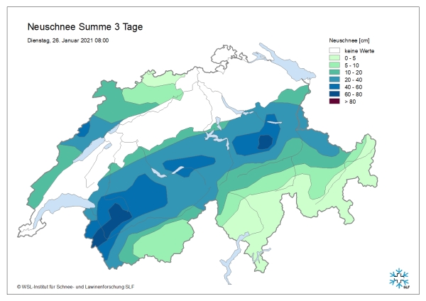 Pendant la nuit du samedi au dimanche, il a encore neigé un peu, plus particulièrement dans l’ouest. La journée était ensuite ensoleillée sur une grande partie du territoire, mais dans l’est le ciel était partiellement nuageux. Après cette pause dans les précipitations, de nouvelles chutes de neige jusqu’à basse altitude sont arrivées le dimanche soir dans l’ouest et le nord. Elles ont donné lieu à quelques problèmes de circulation le lundi matin sur le Plateau. Pendant la journée du lundi, il y a eu des précipitations sous forme d’averses, mais aussi des éclaircies sporadiques. Pendant la nuit du lundi au mardi, il a neigé jusqu’à basse altitude, surtout depuis l’est des Alpes bernoises jusque dans le nord des Grisons. Les quantités de précipitations étaient très variables dans le nord. Globalement, il est souvent tombé de 20 à 40 cm de neige et dans certaines régions de 40 à 60 cm et localement jusqu’à 80 cm (cf. figure 4). Sur le versant sud des Alpes, le temps était resté largement sec et ensoleillé. En altitude, le vent était temporairement modéré à fort de secteur ouest à nord-ouest.