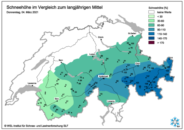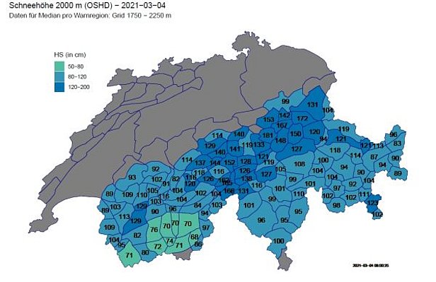 Début mars (le 4 mars), dans la plupart des régions, les hauteurs de neige correspondaient ou étaient légèrement inférieures aux valeurs habituelles (cf. figure 8). Dans les Grisons, elles étaient souvent légèrement supérieures à ces valeurs, tandis que dans l’ouest elles étaient inférieures aux hauteurs moyennes. A 2000 m, il y avait sur une grande partie du territoire de 80 à 120 cm de neige, voire plus, et dans le sud du Valais, les hauteurs de neige étaient de 50 à 80 cm (cf. figure 9).
