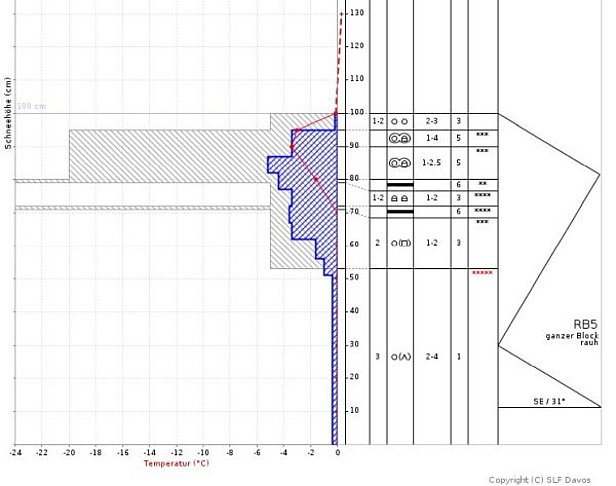 Alors que le manteau neigeux sec n’avait plus guère tendance à provoquer et propager des ruptures, des ruptures dans la neige humide pouvaient être provoquées lors de tests de stabilité du manteau neigeux (cf. figure 7, des explications peuvent être consultées ici sous «Exemple»).