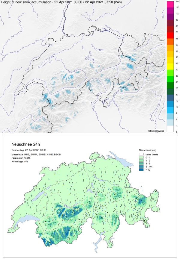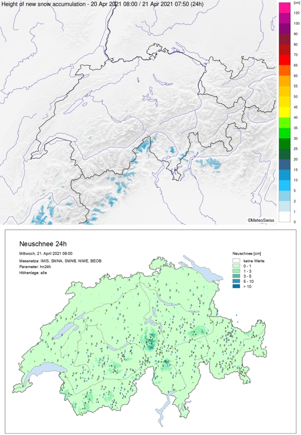 Le temps était souvent ensoleillé. Des nuages convectifs se formaient généralement en cours de journée et il y avait localement des précipitations, généralement sous forme d’averses. Les quantités de précipitations demeuraient faibles (cf. figure 1). Mais en cette période de l’année, la mesure des précipitations est difficile: (1) Les précipitations sont souvent d’origine convective et dès lors très locales. Elles échappent donc souvent à la détection par les réseaux de mesure. De plus (2), les quantités de précipitations et plus particulièrement les quantités de neige fraîche sont souvent nettement plus importantes en altitude que dans la vallée. Il n’est dès lors pas rare qu’au printemps les stations de mesure n’enregistrent guère de précipitations, alors que sur le terrain – et en particulier en haute montagne – on observe nettement plus de neige fraîche (cf. également à ce sujet les limitations du bulletin d’avalanches).