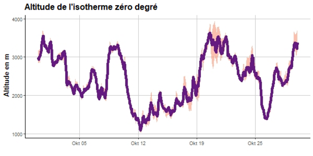 Le mois d’octobre était vraiment frais avec beaucoup de précipitations. Selon MétéoSuisse, c’était le premiers mois depuis près d’un an et demi avec à l’échelle de tout le pays des températures inférieures aux valeurs moyennes. En montagne, elles étaient de 2 à 2,5 °C en dessous de la moyenne des années 1981−2010. L’isotherme zéro degré est descendu à plusieurs reprises en dessous de 2000 m (cf. figure 2). Le début et la fin du mois ont été marqués par deux épisodes exceptionnels de précipitations:
