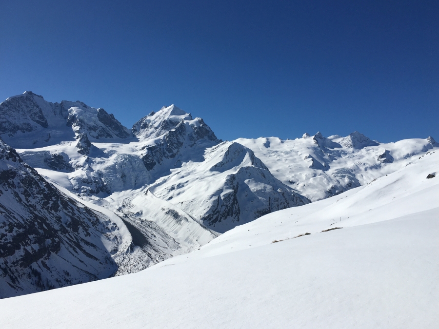 Le temps était généralement ensoleillé avec seulement peu de nuages convectifs en cours de journée. L’isotherme zéro degré est montée à environ 3000 m dans l’ouest et le sud, et à près de 2500 m dans l’est (cf. figure 1). Le vent était faible à modéré de secteur ouest à nord, et une bise modérée soufflait temporairement dans les Préalpes. Pendant les nuits généralement claires, les conditions de rayonnement étaient bonnes, de sorte que la surface neigeuse pouvait geler et était généralement portante le matin. Surtout sur les pentes très raides exposées au nord, il y avait encore en altitude un peu de neige meuble ou de la neige croûtée cassante. Les conditions de randonnées étaient favorables, y compris en haute montagne (cf. série de photos).