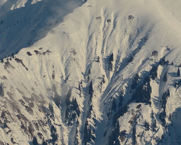 Dans le Bas-Valais, sur le versant nord des Alpes ainsi que dans le nord et le centre des Grisons, des avalanches de glissement se sont produites tout au long de la période décrite (cf. photo 12). D’abord en dessous d’environ 2000 m, puis d’abord dans l’ouest jusqu’à environ 2400 m. Avec le réchauffement sensible du temps à partir du dimanche 12 décembre, l’activité d’avalanches de glissement a augmenté, surtout à basse et moyenne altitude. Les avalanches étaient souvent petites à moyennes, mais en raison des hauteurs considérables de neige, elles atteignaient aussi de plus en plus souvent une grande ampleur. Des avalanches de glissement, mais aussi de petits glissements de neige sur les talus pouvaient menacer les voies de communication. Dans le bulletin d’avalanches du mercredi 15 décembre, le danger d’avalanches de glissement était évalué au degré 3 (marqué) sur le versant nord des Alpes fortement enneigé et dans l’ouest du Bas-Valais.