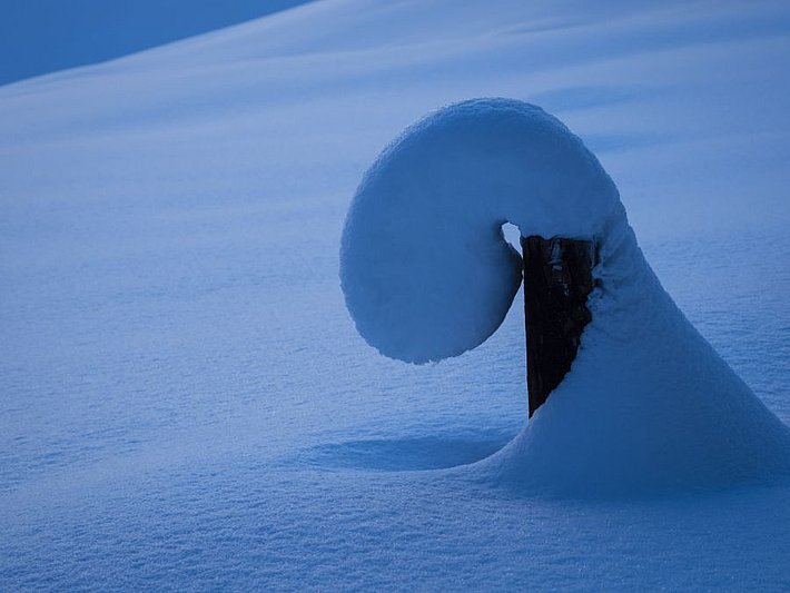 Dans les régions où la neige fraîche était abondante, le vent parfois fort a évidemment transporté beaucoup de neige donnant lieu à la formation d’importantes accumulations de neige soufflée. Celles-ci sont intégrées dans la situation avalancheuse typique «neige fraîche» (cf. photo 10). La situation avalancheuse typique «neige fraîche» est utilisé dans le bulletin d’avalanches chaque fois que l’apport de neige fraîche dépasse environ 30 cm et que les endroits dangereux sont étendus et très répandus. S’il y a moins ou pas de neige fraîche et si les endroits dangereux sont considérés comme des accumulations de neige soufflée, on utilisera la situation avalancheuse typique «neige soufflée» (cf. ci-après).