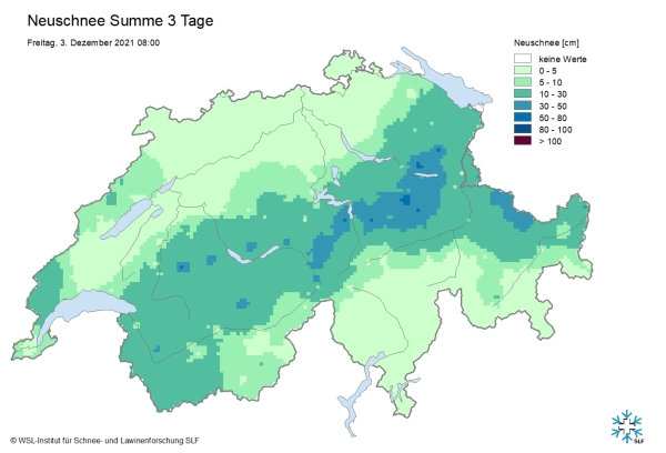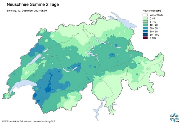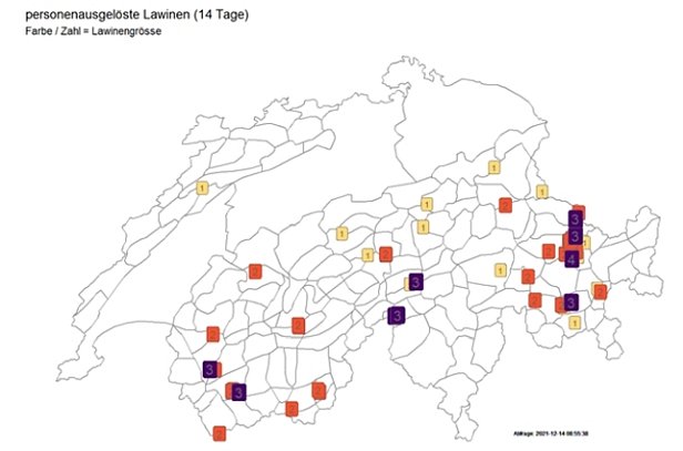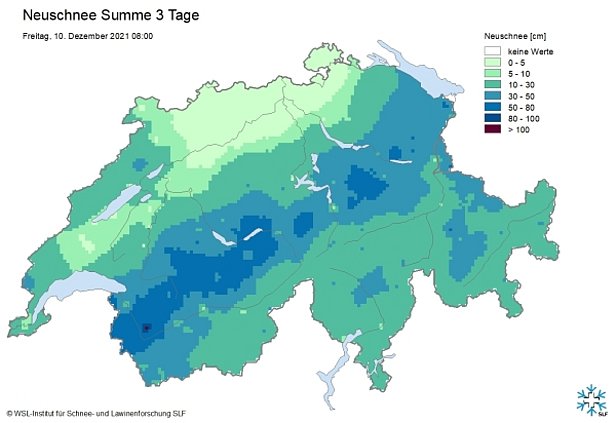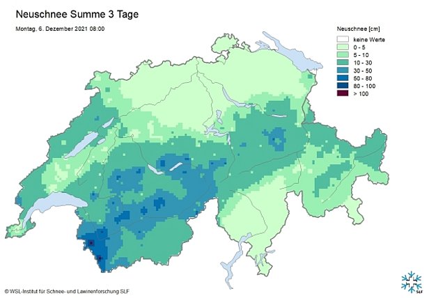 En raison de la constitution fragile du manteau neigeux, d’un réchauffement temporaire, du vent et d’un nouvel apport de 20 à 40 cm de neige fraîche, le degré de danger 4 (fort) a été annoncé pour le jeudi 9 décembre dans certaines parties du Bas-Valais ainsi que du nord et du centre des Grisons jusque dans la vallée de Samnaun. Le danger concernait surtout les zones alpines de sports de neige et la mise en garde s’adressait principalement aux adeptes des sports de neige («fort - skieurs»). Il ne fallait guère s’attendre à de très grandes avalanches descendant jusque dans les vallées et menaçant les voies de communication exposées.