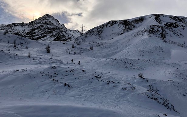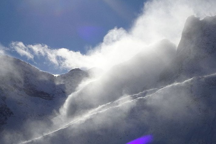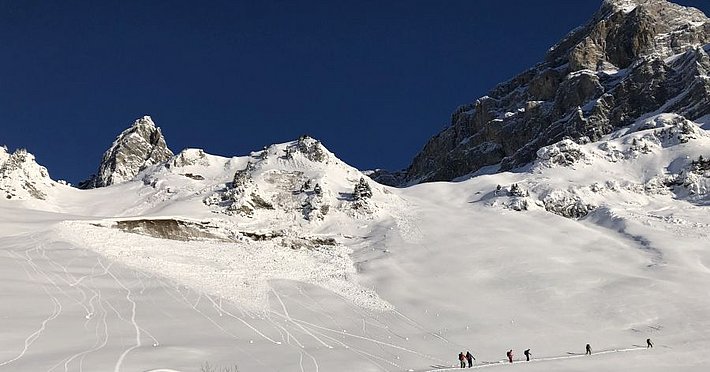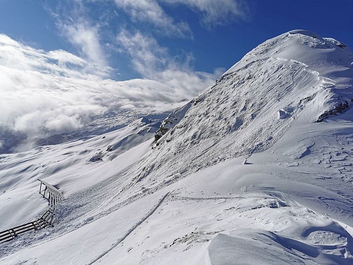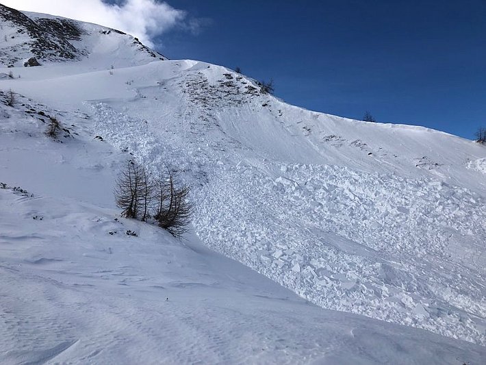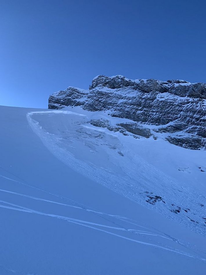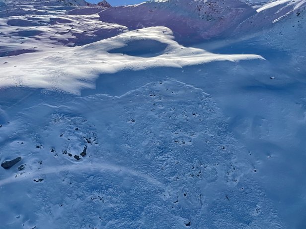 La situation avalanche typique «neige soufflée» dominait la situation dans les régions méridionales avec moins de précipitations du sud du Haut-Valais, du Tessin ainsi que des parties méridionales du centre des Grisons et sud des Grisons. Diverses phases surtout de vent fort de secteur nord y ont transporté parfois intensément de la neige (cf. photo 11). Dans ces régions également, la situation avalancheuse typique «neige ancienne» était aussi présent. Les accumulations de neige soufflée pouvaient souvent se décrocher facilement. Le décrochement avait fréquemment lieu au niveau du passage vers la neige ancienne fragile et les avalanches emportaient toute la neige.