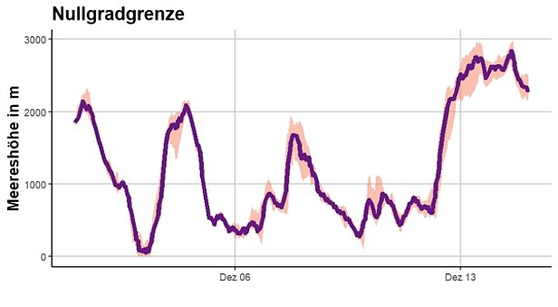 La période de temps froid avec des chutes de neige jusqu’à basse altitude persistant depuis le 25 novembre se terminait brusquement le dimanche avec une hausse sensible des températures. Depuis le dimanche matin jusqu’au lundi après-midi, l’isotherme zéro degré a grimpé de 2000 m – passant de près de 1000 m à environ 3000 m. Du lundi jusqu’au mercredi, le temps était généralement ensoleillé et doux.