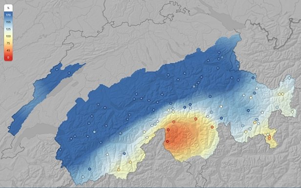 Sur la façade sud des Alpes, où les valeurs correspondantes de l’année dernière atteignaient des niveaux records, elles sont actuellement légèrement inférieures aux données moyennes.