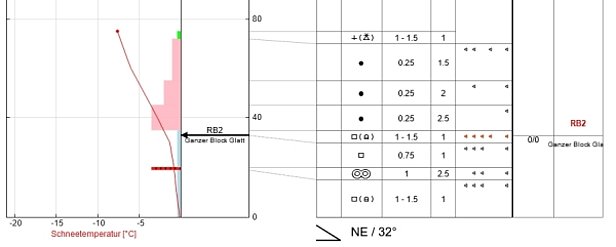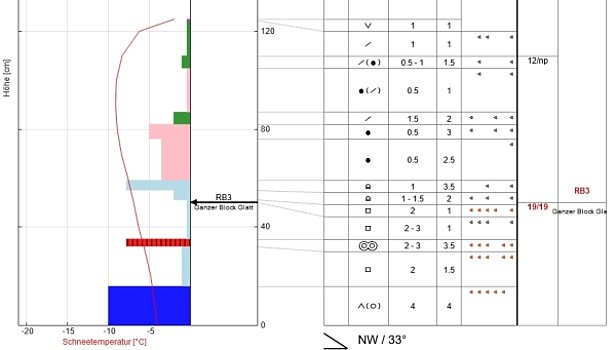 Alors que dans la partie la plus occidentale du Bas-Valais abondamment enneigée ainsi que sur le versant nord des Alpes où le manteau neigeux était de plus en plus recouvert par de la neige fraîche et de la neige soufflée (de 1 à 2 m), un déclenchement d’avalanche par des personnes devenait de plus en plus improbable, la situation avalancheuse typique «neige ancienne» s’aggravait pour les adeptes des sports de neige principalement dans le sud du Valais ainsi que dans le nord et le centre des Grisons où le recouvrement par la neige fraîche et la neige soufflée était plus faible (moins de 0,5 à 1 m). Les tests de stabilité effectués dans ces régions donnaient fréquemment lieu à des ruptures avec des niveaux de charge assez faibles (cf. vidéo 6 et figure 7).