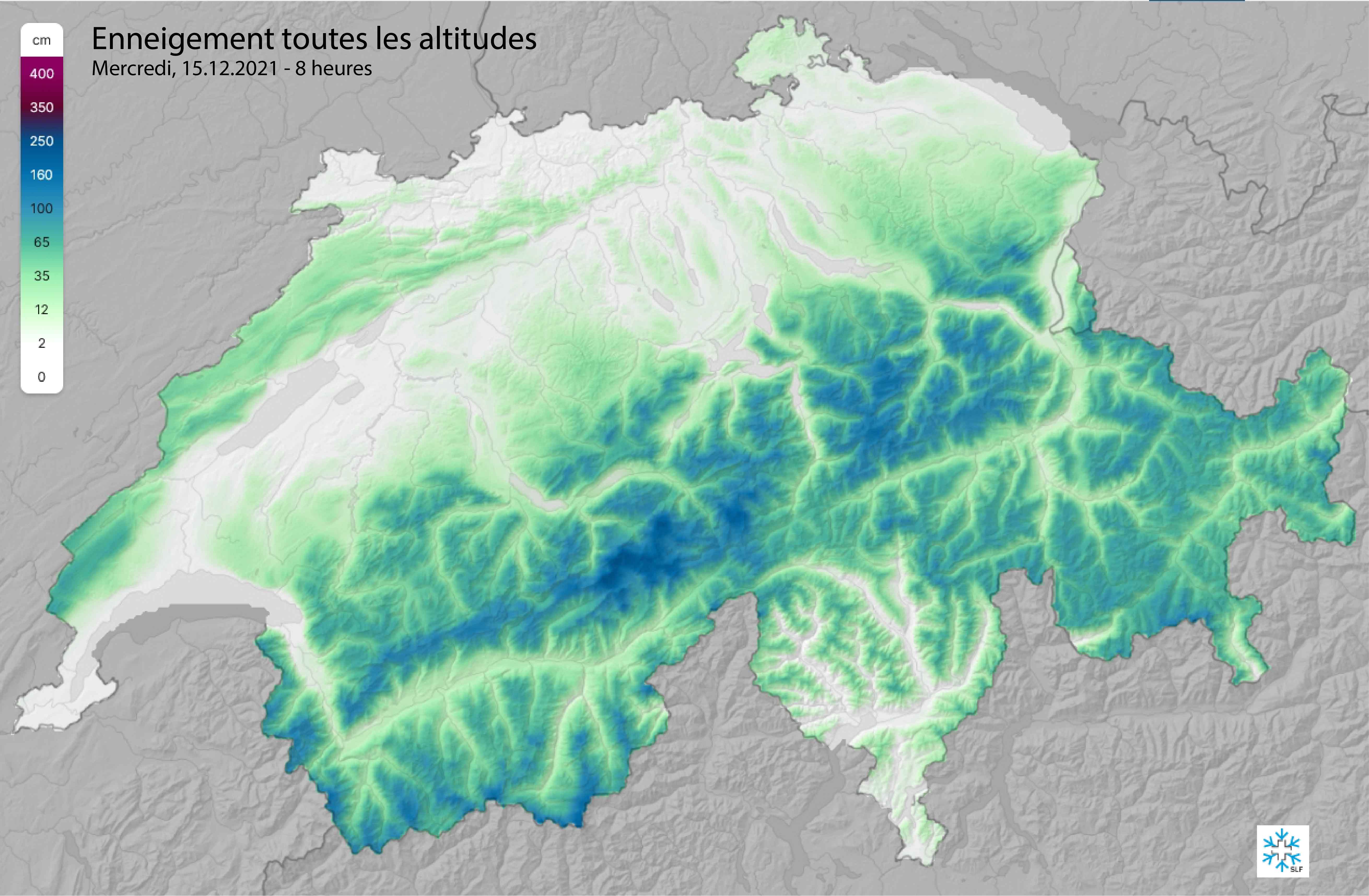 Le mercredi 15 décembre, les Alpes suisses – surtout dans le nord – et aussi le Jura étaient bien enneigés jusqu’à basse altitude (cf. figures 14 et 15).
