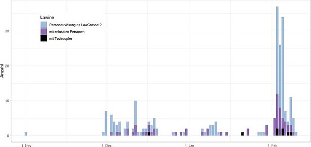 Dans certaines régions, des couches fragiles profondément enfouies dans le manteau neigeux déterminaient la situation avalancheuse critique pour la pratique des sports de neige en dehors des pistes sécurisées. En terrain non sécurisé, les adeptes des sports de neige ont déclenché de nombreuses avalanches, parfois aussi de grande ampleur. Trente-six de ces avalanches ont emporté des personnes. Six personnes ont perdu la vie dans des avalanches.