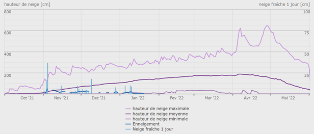 Le 19 janvier, les stations Bosco Gurin (1515 m, TI, mesures depuis 1951) avec 1 cm et Robièi (1890 m, TI, mesures depuis 1966) avec 5 cm affichaient de nouveaux minima de neige pour la mi-janvier. La moyenne pluriannuelle de hauteur neige de la station Robièi pour ce jour est de 134 cm et le maximum est même de 275 cm de neige (cf. figure 7).
