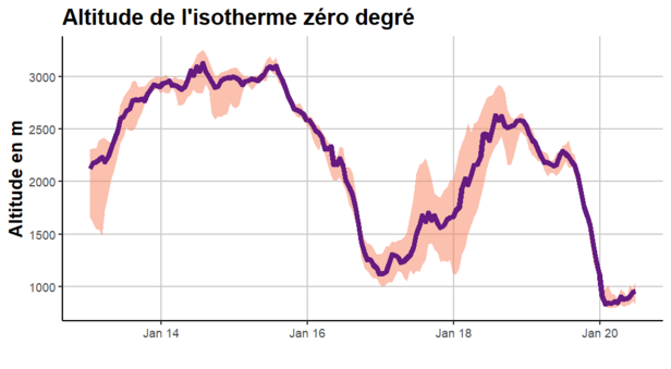 Au début, les températures grimpaient. Le samedi 15 janvier, elles ont atteint une douceur printanière de 10 degrés sur la façade sud des Alpes sous l’effet du vent du nord. Le dimanche 16 janvier, l’anticyclone a commencé à faiblir et un faible front froid a pu traverser la Suisse. Il a donné lieu à un net refroidissement du temps; l’isotherme zéro degré est descendu depuis 3000 m à 1000 m (cf. figure 2). Le front froid n’a toutefois pas apporté beaucoup de précipitations. Celles-ci se sont limitées à quelques flocons de neige pendant la nuit du dimanche au lundi dans l’est. Les mardi 18 et mercredi 19 janvier étaient ensuite déjà à nouveau très ensoleillés. Pendant la nuit du mercredi au jeudi 20 janvier, un nouveau front froid a mis un terme à la période marquée de beau temps. Dans les parties les plus orientales des Alpes bernoises, sur le centre et l’est du versant nord des Alpes et dans le nord des Grisons, il est tombé de 5 à 15 cm de neige.