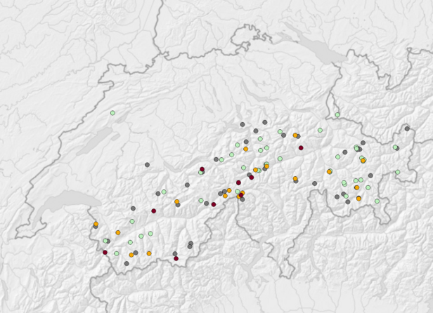 La météo anticyclonique a également eu un impact sur les hauteurs de neige: En dessous de 2000 m, certaines parties de l’ouest du Tessin et de la région du Simplon n’ont encore jamais enregistré si peu de neige que cette année depuis le début des mesures (cf. photo 6).