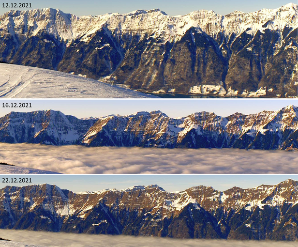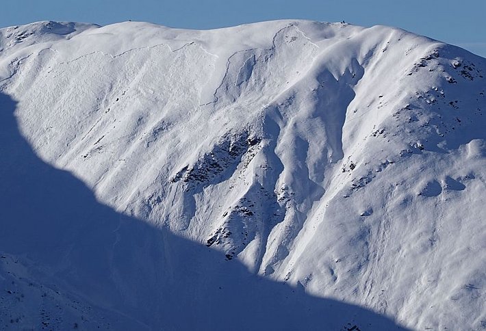 Au début, les avalanches de glissement constituaient encore la principale situation avalancheuse typique sur le versant nord des Alpes. Pendant les journées ensoleillées et très douces (décrites dans le dernier rapport hebdomadaire), l’activité d’avalanches de glissement avait toutefois déjà dépassé son apogée lorsque, sur les pentes orientées au sud en dessous de 2400 m, de nombreuses avalanches de glissement de taille petite et moyenne et rarement aussi de grande ampleur s’étaient déclenchées. Le nombre d’avalanches de glissement signalées diminuait chaque jour un peu plus. D’une part, parce que de nombreuses pentes étaient déjà purgées – comme le montrent par exemple les images de la webcam sur l’Axalp ob Brienz (BE) (cf. photo 2), et d’autre part aussi, parce que les températures diminuaient à nouveau un peu. Finalement, des avalanches de glissement n’étaient plus signalées que très localement.