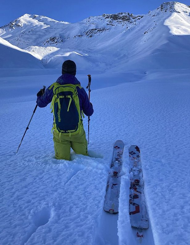 Vidéo 4: Profil de neige avec test du bloc glissant, relevé à côté d’une avalanche déclenchée la veille par une personne sur une pente exposée à l’ouest à 2800 m. Le bloc glissant – une mini-avalanche – a donné lieu à une rupture lors du premier saut, ce qui correspond à une charge déjà un peu plus importante, mais alors pour tout le bloc, et permet d’en déduire une bonne propagation de la rupture (Älplihorn, Davos; vidéo: SLF/L. Dürr, 20.12.2021).
