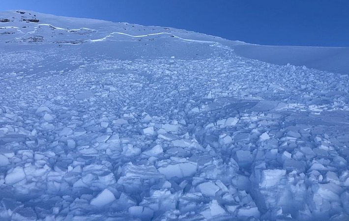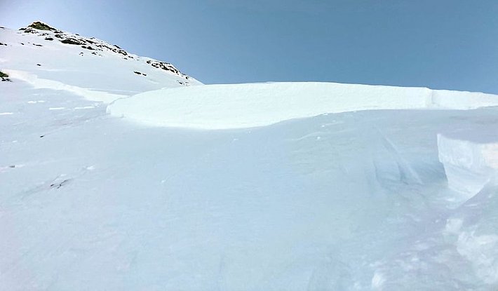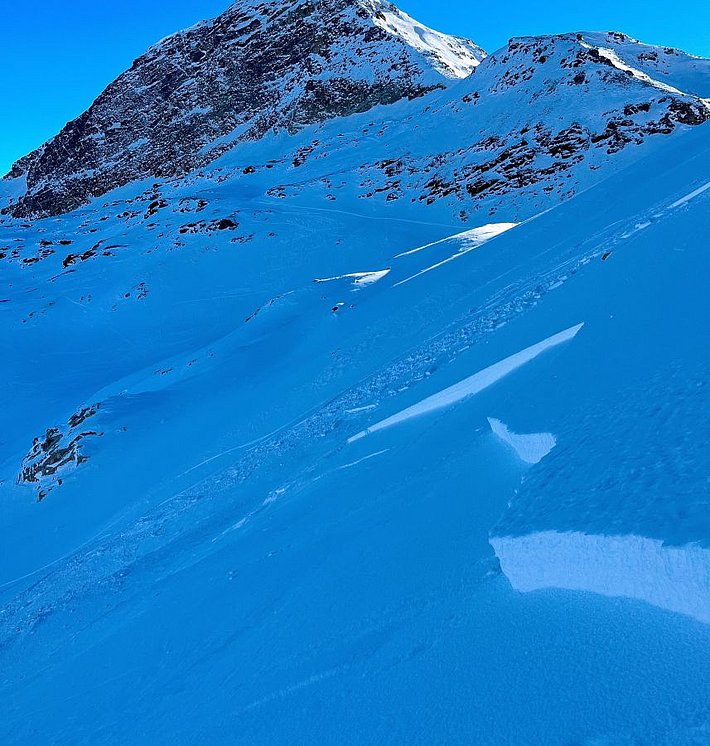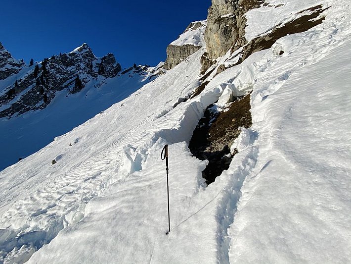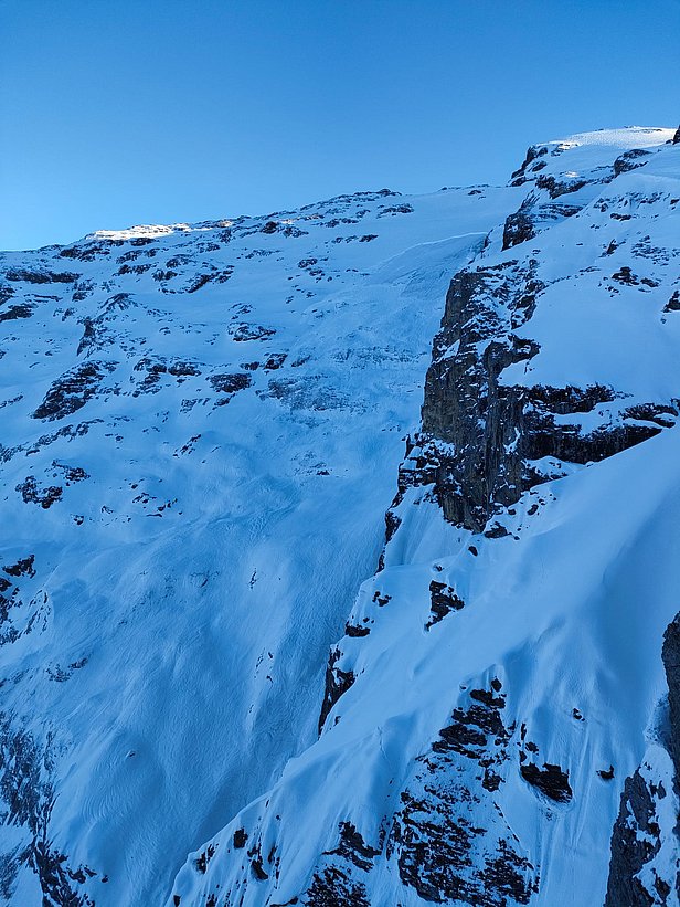 Le 21 décembre, une très grande avalanche a eu lieu au Galtiberg (en dehors du domaine skiable du Titlis, OW) à 2700 m. Elle a vraisemblablement été provoquée par un mouvement du glacier (cf. photo 9). L’avalanche avait une largeur de plusieurs centaines de mètres et près de 3 km de longueur. Tout le manteau neigeux s’était décroché. Etant donné que l’avalanche s’était produite dans une zone de hors-piste très fréquentée après des chutes de neige, une opération de recherche a immédiatement été entreprise à titre de contrôle et la police s’est assurée qu’il n’y avait pas de personne portée disparue. Heureusement, personne ne se trouvait dans la zone couverte par cette avalanche.