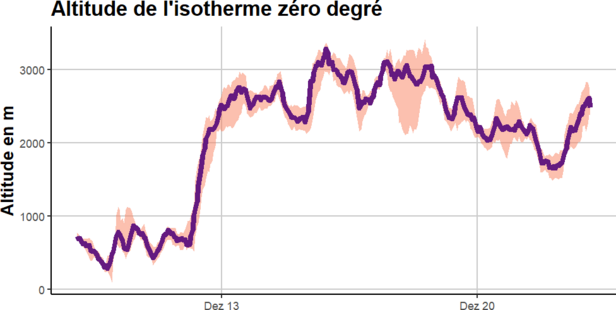 Déterminée par une zone de haute pression, la météo de cette semaine couverte par le rapport hebdomadaire est rapidement résumée: En montagne, après des nuits claires, les journées étaient toutes ensoleillées. Le vent était temporairement modéré à fort de différents secteurs et a donné lieu à la formation de petites accumulations de neige soufflée. L’élément marquant – et inhabituel en cette période de l’année – était que l’isotherme zéro degré se situait pendant plusieurs jours à 3000 m (cf. figure 1). Sur les pentes à l’ombre, les températures douces n’étaient cependant guère perceptibles. Même au cours de ces journées, on y a mesuré des températures de -10 °C ou encore plus basses à la surface neigeuse.