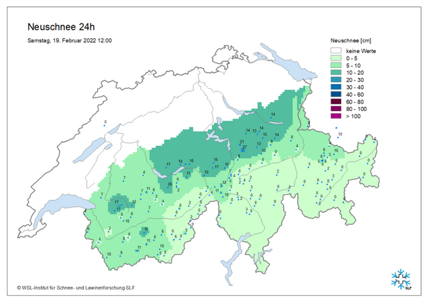 Entre vendredi soir et samedi midi, il a neigé dans le nord (cf. figure 2). La limite des chutes de neige est descendue rapidement jusqu’à basse altitude. La journée était assez ensoleillée dans le sud et nuageuse ailleurs. La température est descendue nettement et était à la mi-journée à 2000 m encore de -6 °C dans le nord et de -1 °C dans le sud. Ce refroidissement sensible a eu un effet stabilisateur surtout à basse et moyenne altitude sur le manteau neigeux partiellement mouillé.