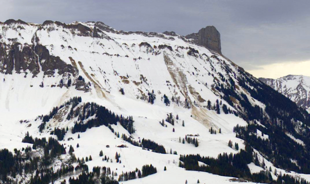 Vidéo 6: Avalanches déclenchées artificiellement sur le flanc sud-est de la Chamossaire (2616 m, Arbaz, VS). Le risque élevé de décrochement et la propagation spatiale des ruptures confirment le bien-fondé du degré de danger 4 (photo: E. Morard, 22.02.2022).