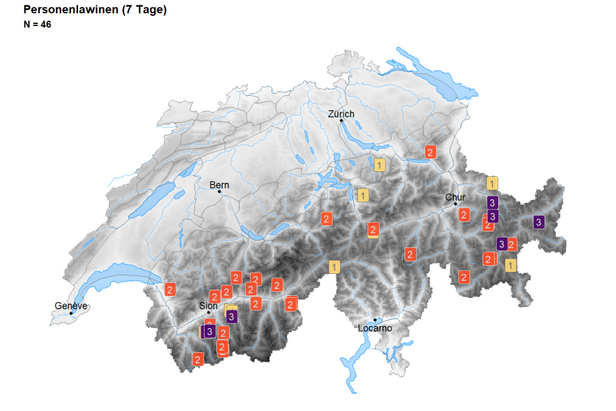 Au cours de la période couverte par le présent rapport, 46 avalanches déclenchées par des personnes ont été signalées au service des avalanches. Beaucoup de ces avalanches se sont produites en Valais et dans les Grisons (cf. figure 10). Ces 46 avalanches ont touché au total 16 personnes, dont 5 ont été entièrement ensevelies. Deux personnes ont perdu la vie dans une avalanche au Piz Zuort (3118 m, Scuol, GR).