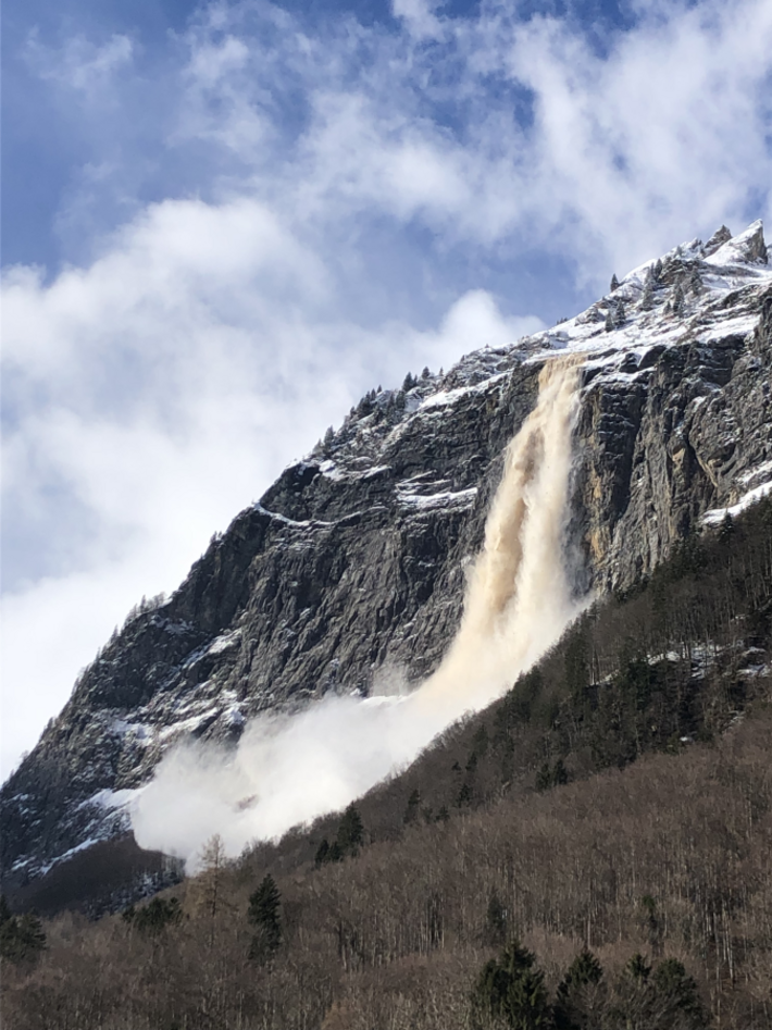 Après la fin pluvieuse de la dernière période couverte par le rapport hebdomadaire, l’isotherme zéro degré a grimpé jusqu’à une altitude très élevée de 3200 m le vendredi. Avec un vent fort de secteur sud-ouest, le temps était assez ensoleillé dans le sud et nuageux ailleurs. Sous l’influence de la douceur du temps et de la pluie des jours précédents, de nombreuses avalanches de neige mouillée et de glissement se sont produites à basse et moyenne altitude, surtout sur le versant nord des Alpes (cf. photo 1).