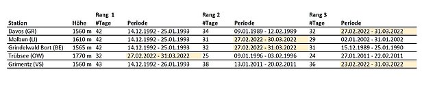 Tableau 1: Nombre de jours sans neige fraîche pour une sélection de champs de mesure manuelle. La période actuelle est marquée en jaune. Sur le champ de mesure de Trübsee, il n’y a jamais eu au cours des 40 dernières années de période plus longue de temps sec en hiver. À Malbun et Grindelwald Bort, cela ne s’est produit qu’une seule fois et à Davos et Grimentz, seulement deux fois.