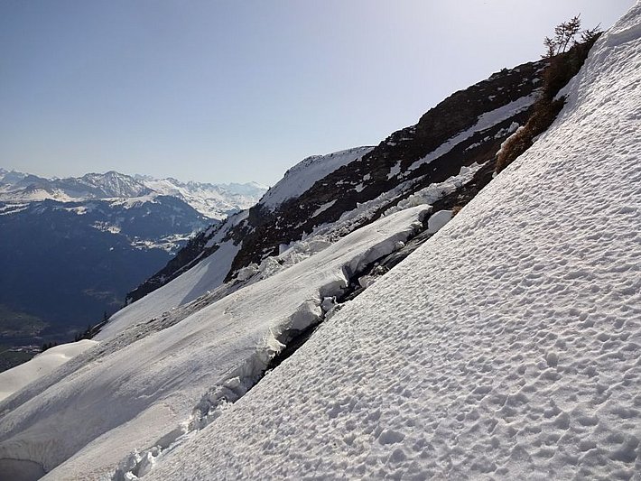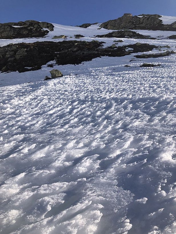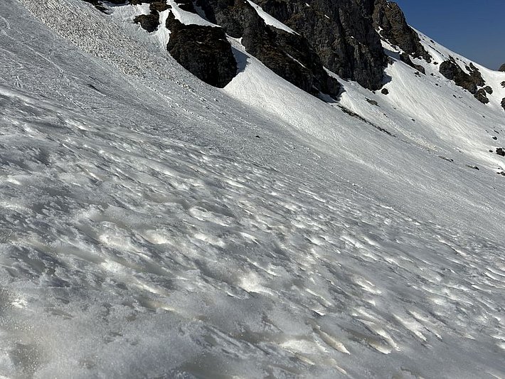 Des conditions printanières stables avec des nuits claires et des journées très ensoleillées ont dominé cette période couverte par le rapport hebdomadaire. Au lieu de tapis de neige gros sel à l’aspect de velours, des pénitents rugueux de neige se sont en revanche formés en de nombreux endroits à la surface neigeuse. Le soleil généreux et l’air sec ont provoqué la sublimation de la neige directement à la surface. De ce fait, même sur les pentes ensoleillées, pratiquement pas d’eau de fonte n’a pénétré dans le manteau neigeux et il n’y a donc eu que peu d’avalanches de neige mouillée et de glissement. Avec la fin de la période couverte par le présent rapport se terminait également une phase exceptionnellement longue de temps sec.