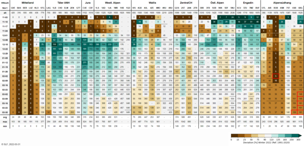 Tableau 2: Cumuls de neige fraîche depuis le 1er novembre 2021 à une sélection de stations (altitude de la station sur la deuxième ligne), les relevés étant effectués chaque semaine, le mercredi. Les données reflètent les cumuls absolus de neige fraîche par station et par date. Les couleurs indiquent l’écart relatif par rapport à la moyenne pluriannuelle de la période de 1991 à 2020 (troisième ligne à partir du bas). Les nouveaux minima/maxima des cumuls actuels de neige fraîche sont entourés en rouge. Une augmentation du cumul de neige fraîche est à chaque fois marquée par un trait horizontal.