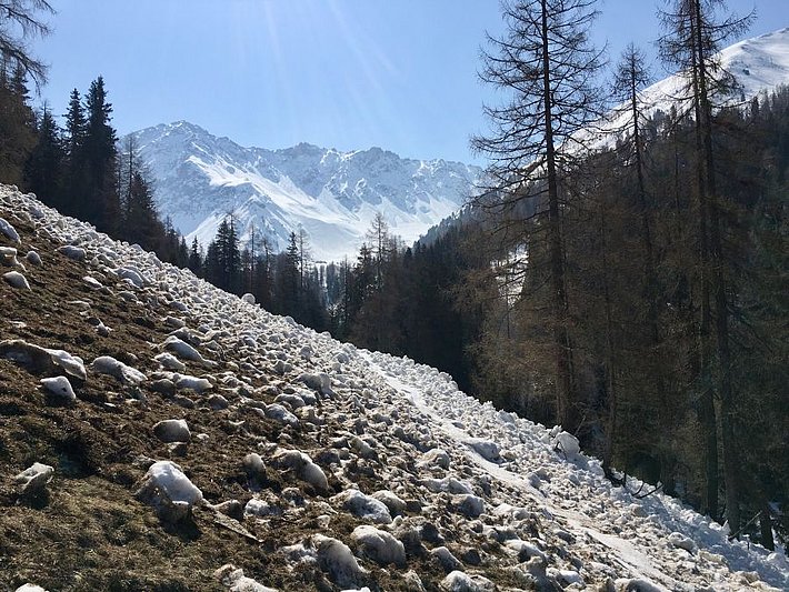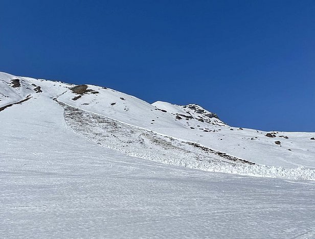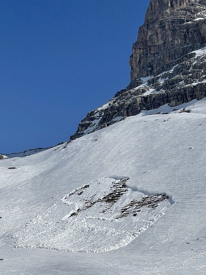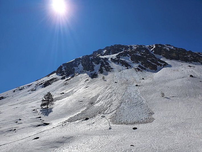 Etant donné que l’humidification ne progressait que de manière hésitante à de nouvelles altitudes et que le manteau neigeux pouvait à chaque fois se stabiliser sous l’effet du rayonnement nocturne, les prévisions d’avalanches tablaient sur une augmentation modérée du danger d’avalanches de neige mouillée et de glissement en cours de journée. Mais cette analyse ne prenait pas en considération des couches fragiles marquées encore présentes dans les régions intra-alpines du Valais et surtout des Grisons. Compte tenu du fait que les couches de ce genre réagissent de manière particulièrement sensible à la première humidification et qu’à la fin de la période couverte par le rapport précédent, des départs d’avalanches avaient déjà été observés dans la neige ancienne dans les Grisons, le risque potentiel d’avalanches de neige mouillée dans les Grisons avait été estimé à un niveau plus élevé. Pour certaines parties du centre des Grisons, de l‘Engadine et du val Müstair, un danger marqué d’avalanches de neige mouillée en cours de journée était ainsi annoncé le vendredi 25 mars et le samedi 26 mars. L’activité avalancheuse demeurait toutefois inférieure aux attentes et le danger marqué d’avalanches n’a pas été confirmé, tout au moins par l’activité avalancheuse. Dans toutes les régions, on n’a observé que peu d’avalanches (cf. photo 2), y compris là où la constitution du manteau neigeux était particulièrement défavorable.