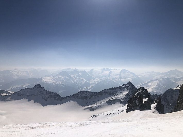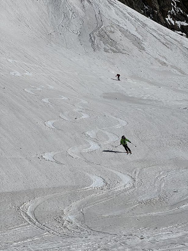 Sur les surfaces rugueuses, le «plaisir de la glisse» était limité en de nombreux endroits. La devise était de n’entamer la descente qu’après le dégel des formations de pénitents de neige. Il y avait cependant ci et là aussi des surfaces plus lisses – moins cahoteuses et décorées de poussière du Sahara (cf. photo 4).