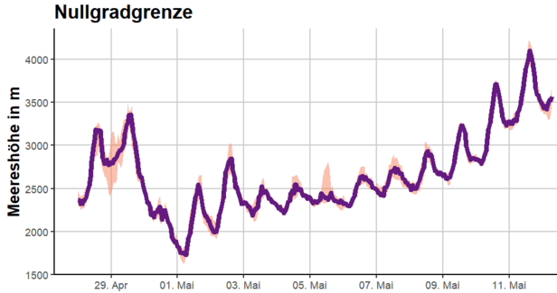 La première semaine de mai a souvent été maussade en montagne. De faibles précipitations se sont produites à plusieurs reprises, avec d’abord une limite pluie-neige à 2000 m environ. Avant le dimanche 8 mai, cette limite est remontée jusqu’à 2500 m environ (figure 4). Les stations de mesure en haute montagne (au-dessus de 3000 m) étant rares, il est difficile d’y estimer la quantité de neige tombée au cours de la première décade de mai. À titre indicatif, ce pourrait être de 50 et 80 cm dans le sud du Haut-Valais, et entre 20 et 50 cm ailleurs.