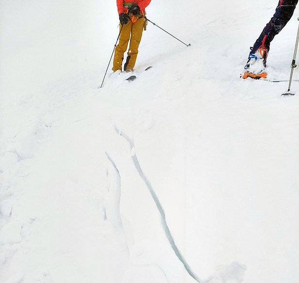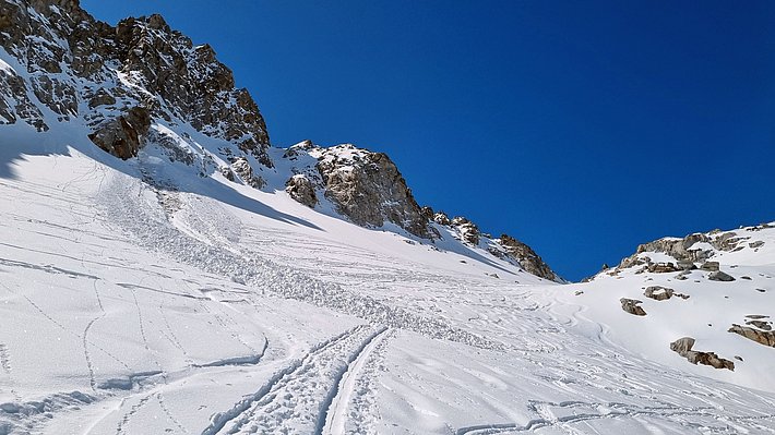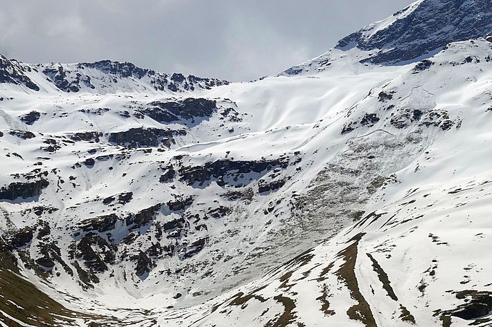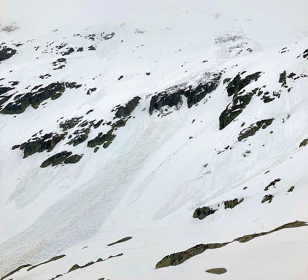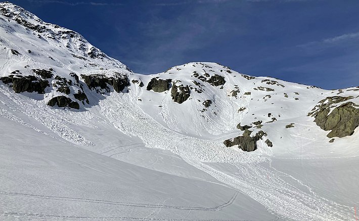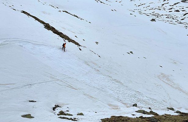 Avec la montée continue de l’isotherme zéro degré et de la pluie jusqu’à 2800 m, le manteau neigeux s’est de plus en plus humidifié, même sur les versants nord au-dessus de 2500 m. Cela a entraîné une perte de sa stabilité. Par conséquent, de nombreuses avalanches de neige mouillée de taille moyenne (taille 2) et parfois aussi de grande taille (taille 3) se sont déclenchées (photo 6). C’est surtout dans les régions intra-alpines du Valais et des Grisons qu’elles ont parfois emporté tout le manteau neigeux. Très localement, des avalanches de neige mouillée ont été déclenchées par des personnes (photo 7).