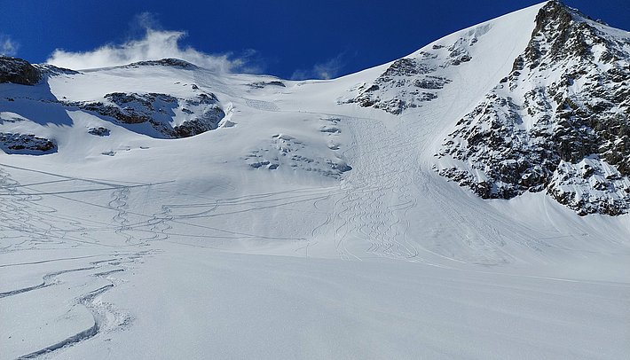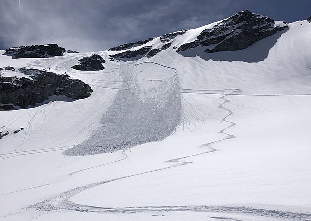 Le lundi 9 mai, il y a eu alternance de soleil, de nuages cumuliformes et d’averses parfois fortes avec de la pluie jusque vers 2800 m d’altitude. À partir du mardi 10 mai, le temps a été généralement ensoleillé. L’isotherme zéro degré est montée jusqu’à 4000 m environ. Des avalanches de neige mouillée se sont déclenchées sur les versants nord ainsi qu’en général en haute montagne (photo 8). Bien que très rares, des déclenchements d’avalanches de plaque mouillées sont également possibles par des personnes lorsque le manteau neigeux est fragile (photo 9).