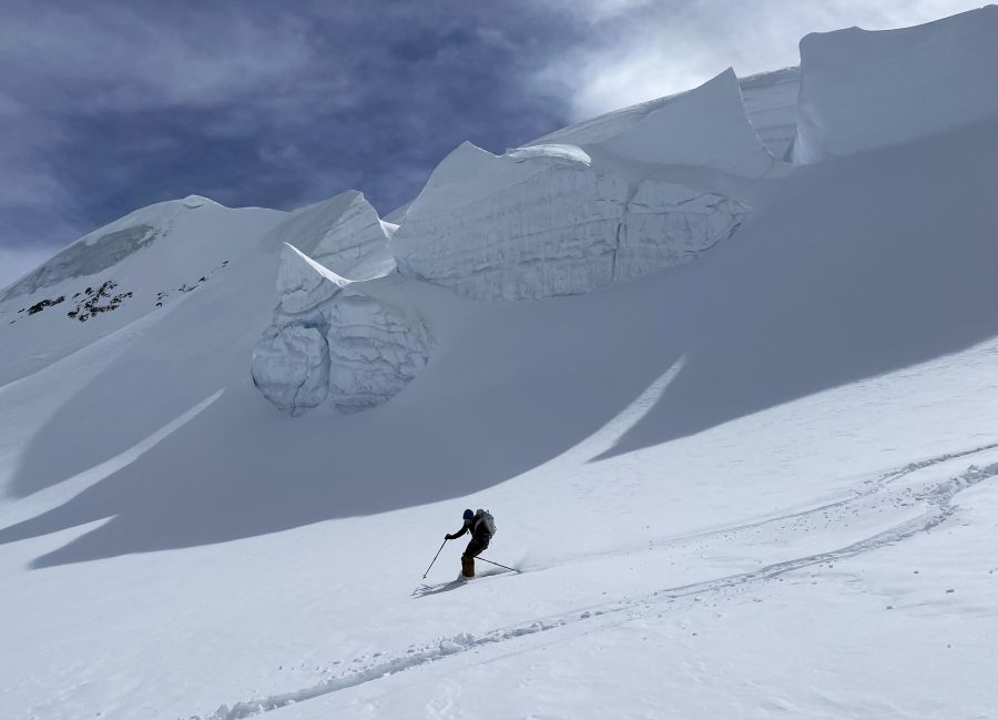 Le lundi 9 mai, il y a eu alternance de soleil, de nuages cumuliformes et d’averses parfois fortes avec de la pluie jusque vers 2800 m d’altitude. À partir du mardi 10 mai, le temps a été généralement ensoleillé. L’isotherme zéro degré est montée jusqu’à 4000 m environ. Des avalanches de neige mouillée se sont déclenchées sur les versants nord ainsi qu’en général en haute montagne (photo 8). Bien que très rares, des déclenchements d’avalanches de plaque mouillées sont également possibles par des personnes lorsque le manteau neigeux est fragile (photo 9).
